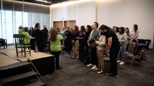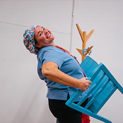 Experta en paciente simulado, comunicación interpersonal, feedback y liderazgo sindical. En esta imagen, personifica a Karin Salgado (Ley Karin) en la obra Mi luz está aquí.